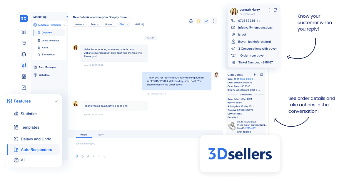 3Dsellers' helpdesk suite integrates seamlessly with the multichannel order manager, so you can view order details right alongside the buyer's message, and even handle returns, resolution cases, and disputes without leaving the platform. For sellers looking to put the tips in this guide into practice at scale, 3Dsellers' dedicated helpdesk makes it much easier to stay responsive, organized, and professional.