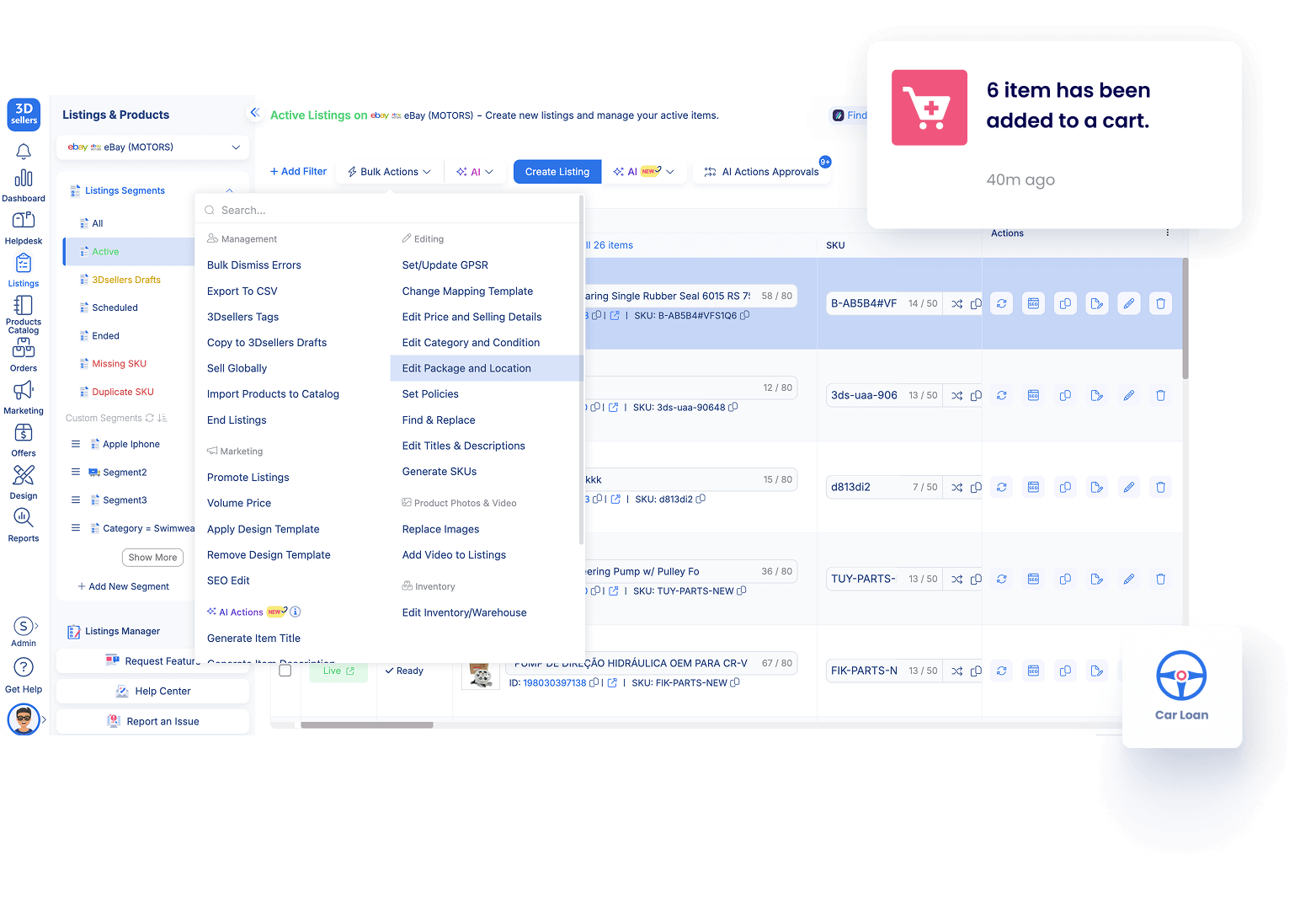 3Dsellers enables you to automate all these tasks and more thanks to robust automations and a selection of smart AI tools. With 3Dsellers, you'll be able to automate repetitive tasks that keep your car parts business running, and enjoy a specialized set of tools designed specifically for eBay Motors selling. From customizable listing templates to AI-powered listing creation, from CSV-managed compatibility lists to an AI-integrated helpdesk suite, you'll be able to work more efficiently and scale more effectively across the board.