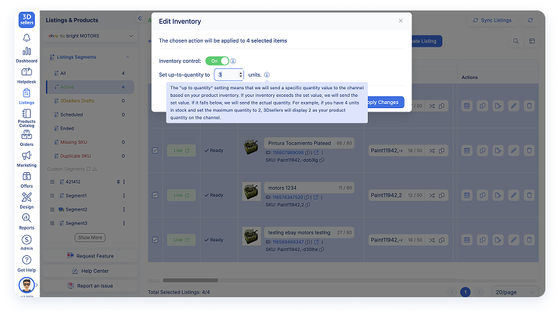 3Dsellers lets you not only automatically sync inventory, but to create completely customized automations to adjust inventory on every sales channel. You can create automation rules that completely exclude certain products from listing on a particular channel, set inventory limits, and more, all of which eliminate the risk of human error in your multi-store inventory management workflows.