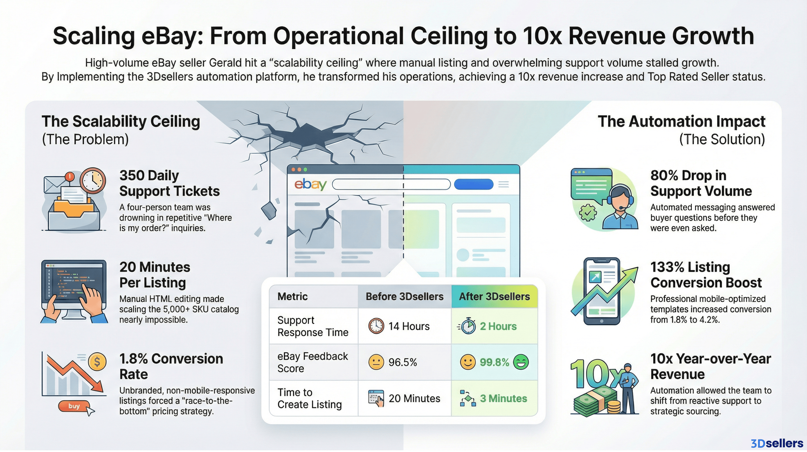 The Impact: "3Dsellers didn't just save us time. It gave us leverage. We're now a 10x bigger eBay business with the same core team, because the system scales and we don't have to." — Gerald