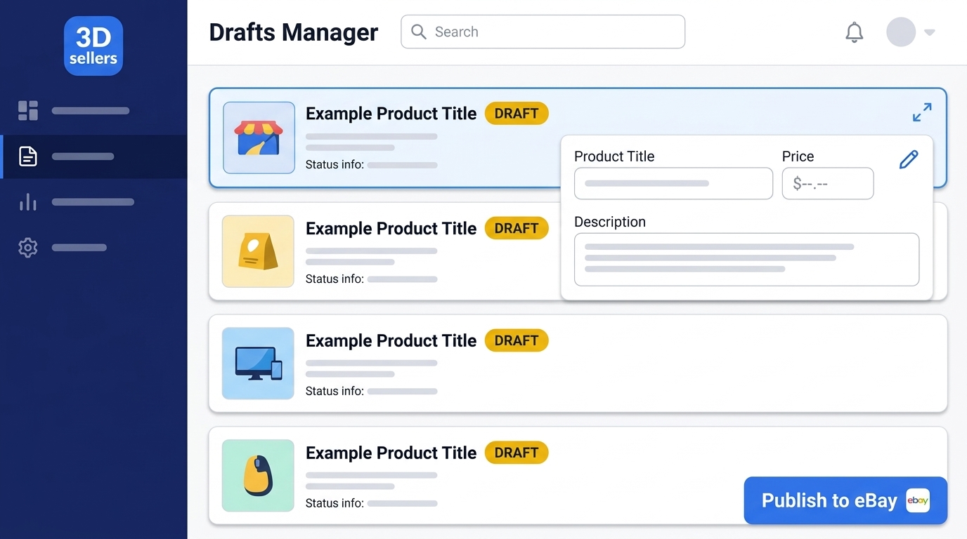Nothing goes live automatically. Every AI-generated listing lands in your Drafts, where you can review the title, description, item specifics, and pricing before publishing. Full control, every step of the way.