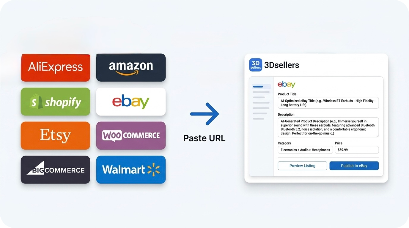 Paste product URLs from AliExpress, Amazon, eBay, Shopify, Etsy, WooCommerce, BigCommerce, or Walmart. The AI is trained on eBay listing patterns — titles follow eBay character limits, categories match eBay's taxonomy, and item specifics match what buyers actually search for.
